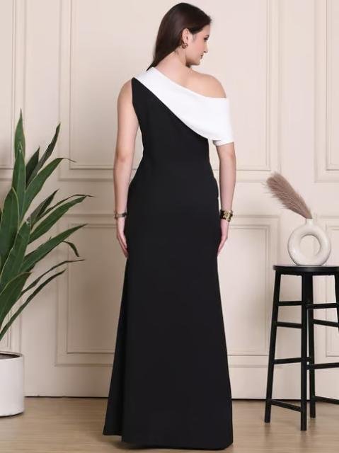 Unveil elegance with this stunning black formal dress, designed to captivate with its sleek, regular fit and sophisticated solid pattern. The short sleeves add a touch of modernity, while the one-shoulder design exudes a bold, fashion-forward statement. Crafted from a luxurious blended fabric, it promises comfort and style in equal measure. The discreet closure ensures a seamless silhouette, making it the perfect choice for any formal occasion where you wish to leave a lasting impression.